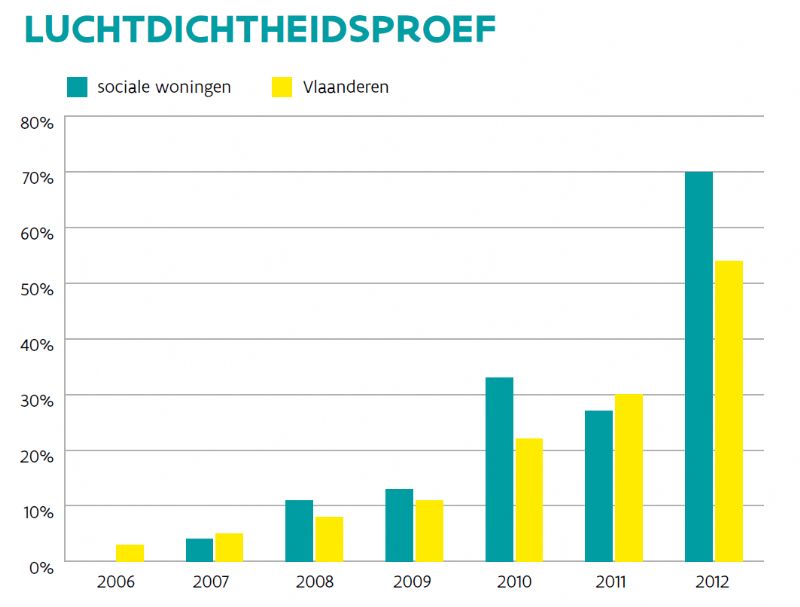 Het percentage van woningen waarin een test wordt uitgevoerd, neemt jaarlijks toe. Sociale woningen worden vaker getest dan het Vlaamse gemiddelde: bij 70% van de nieuwbouwprojecten uit 2012 werd een luchtdichtheidsmeting uitgevoerd. De gemiddelde luchdichtheidswaarde (v50) die bereikt wordt, is 4,3 m3/hm2. Dat is iets hoger dan het Vlaamse gemiddelde van 3,7 m3/hm2.
