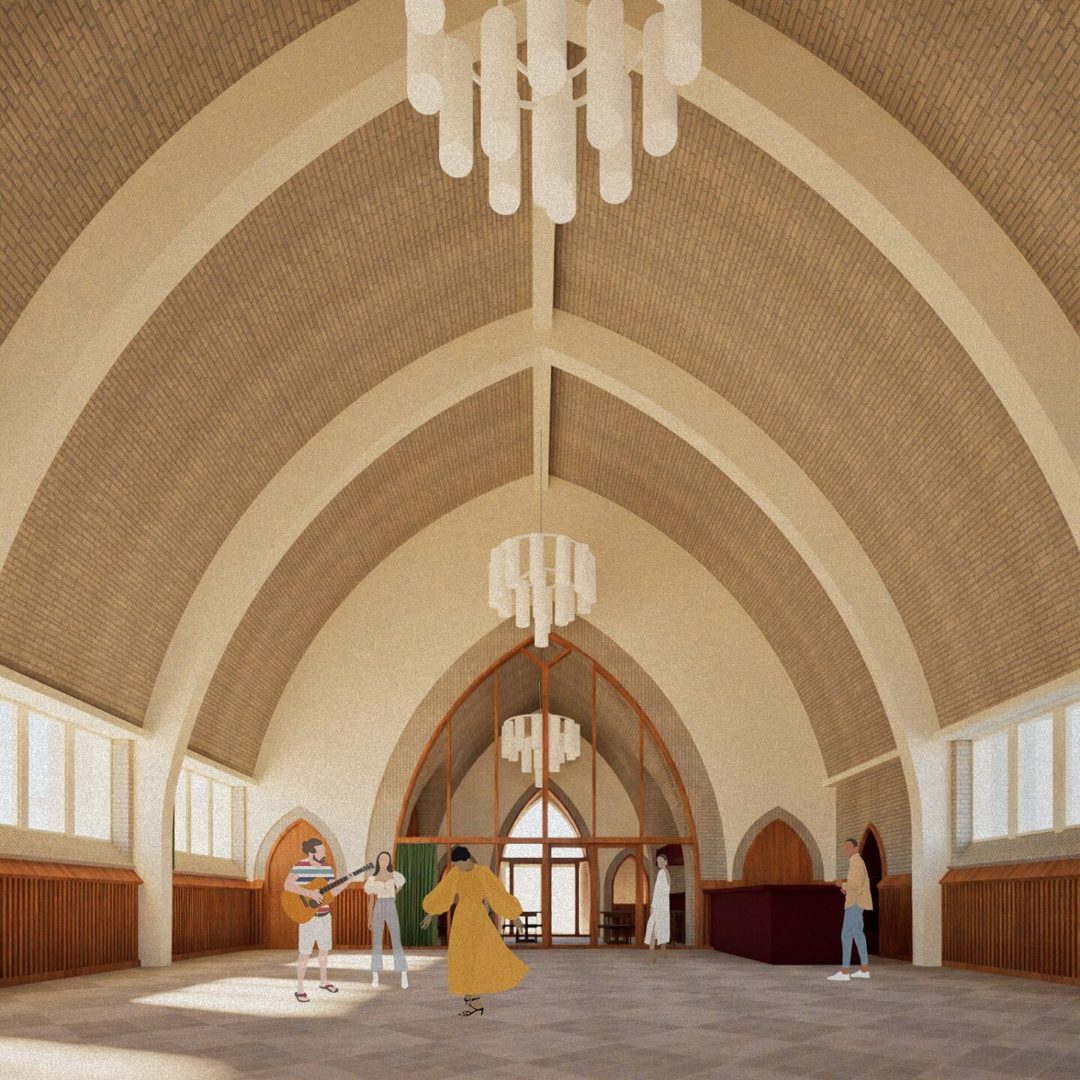 Die keuze is architecturaal consequent: in plaats van de kerk op te delen in een reeks losse kamers, wordt de bestaande ruimtelijke hiërarchie benut. Het koor en de kapellen krijgen een programma dat om nabijheid, warmte en bediening vraagt; het schip krijgt het programma dat baat heeft bij volume, overzicht en flexibiliteit. Zo volgt de herbestemming de logica van het gebouw, terwijl de nieuwe functies het gebouw opnieuw “doen werken” op een hedendaagse manier.