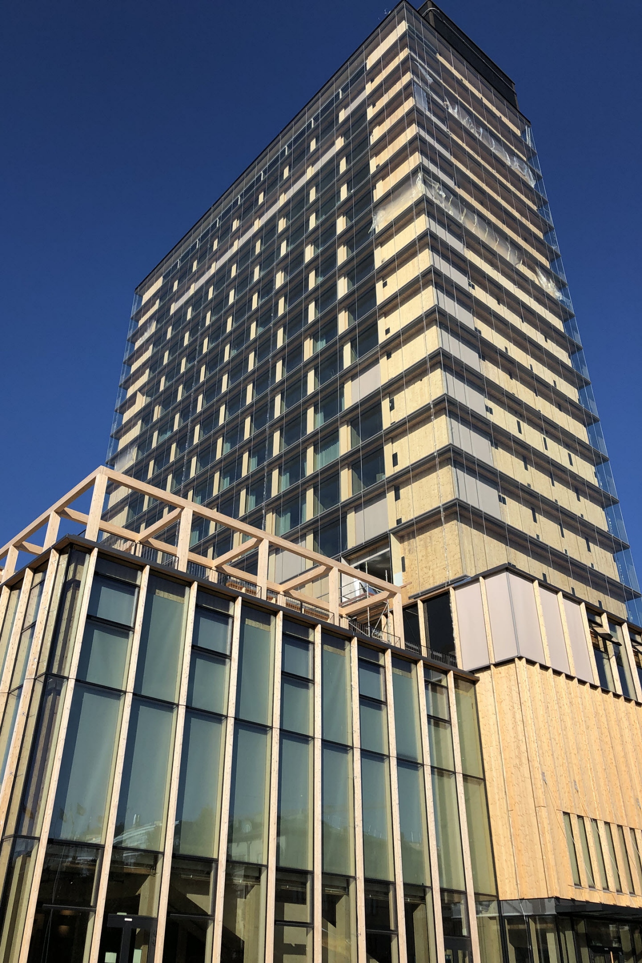 De Scandinavische landen kennen al een lange traditie van houtbouw. Een houten constructie die in architectuurkringen de krantenkoppen haalt, is Sara Kulturhus in het noorden van Zweden. Het multifunctionele complex met kunstgaleries, een conferentiecentrum en een boetiekhotel van 20 verdiepingen met een glazen gevel is volledig uit hout opgetrokken, inclusief de acht liftschachten, en is uitgerust met liften van Schindler.