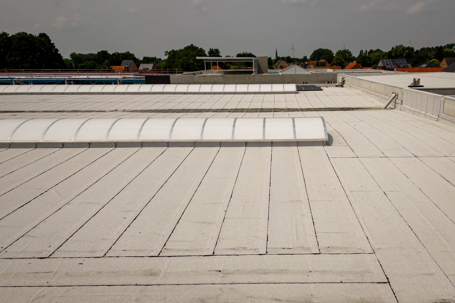 Verder stelde Soprema ook voor om te kiezen voor een mechanisch bevestigd systeem in plaats van een gelijmd systeem. “De dakmembranen kunnen op deze manier in de toekomst bij de demontage van het gebouw gemakkelijk worden gescheiden”, zegt Joeri. “Zo kunnen we het oude dakmembraan gebruiken als grondstof voor een nieuw membraan. Het membraan kan, als de klant dit wenst, over een veertigtal jaar terug opgehaald worden. Een gelijmd systeem valt achteraf moeilijker te scheiden, en is dus ook moeilijker om te recycleren.”