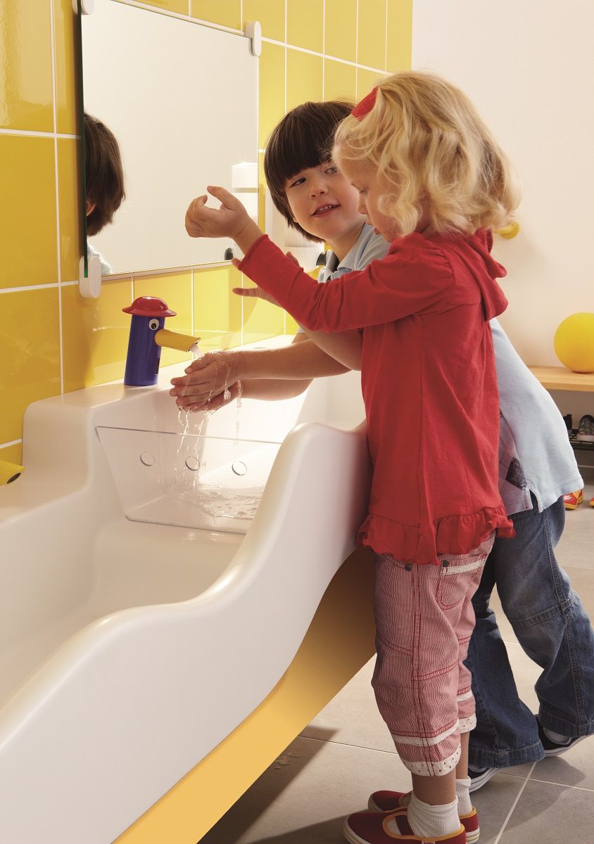 Keramag is dé specialist wat betreft sanitaire voorzieningen voor kinderopvang en scholen. De wasplaats concepten van ‘4Bambini en het kind’ zijn speciaal aangepast aan de verschillende leeftijden van de kinderen en zijn ergonomisch en functioneel. Op die manier kunnen de kinderen de kraan gemakkelijk bereiken wat het leerproces van de hygiënische zelfstandigheid op een speelse manier bevordert.