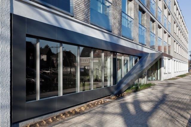 Het centrum van Maasmechelen ondergaat de laatste jaren een ware metamorfose. Rond een nieuw aangelegd park wordt een ‘centrumcluster’ gerealiseerd, een nieuw stadsdeel met diverse functies dat Maasmechelen definitief op de kaart moet zetten als een ambitieuze gemeente die meer dan ooit klaar is voor de toekomst. Naast het Sociaal Huis (met OCMW- en gemeentediensten) en enkele appartementsblokken is ook woonzorgcentrum De MaasMeander een belangrijke exponent van deze vernieuwingsoperatie. Het volume past met zijn sobere, duurzame uitstraling en doordacht schaalniveau perfect bij de gebouwen in de omgeving. Het streekgebonden gebruik van warm ogende, zandkleurige steen vormde voor de architecten een belangrijke inspiratiebron bij het ontwerpen van de constructie. De grotendeels geprefabriceerde gevels zijn opgebouwd uit metselwerk of wit architectonisch beton, die met hun wisselwerking voor een interessante visuele dynamiek zorgen. Het bovenste niveau, dat plaats biedt aan de serviceflats, is dan weer bekleed met zink.