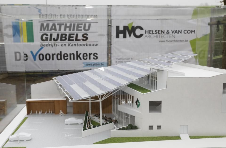 De realisatie van de Bouwcampus was een BIM-project bij uitstek. Het bouwteam zette eerst en vooral in op de ontwikkeling van een optimaal uitvoeringsmodel door de knowhow van alle betrokken disciplines – architectuur, technieken en uitvoering – te bundelen in een digitale 3D-omgeving, waardoor het bouwproces uitermate vlot verliep. Daarnaast werd de BIM-methodiek ook gebruikt om het toekomstige gebouw in verschillende stadia van het project te visualiseren. Gert Janssen, Directeur Engineering & Ontwikkeling bij Mathieu Gijbels: “In de wedstrijdfase was er al het beruchte dronefilmpje, waarbij we via augmented reality – een 3D-visualisatie op basis van het BIM-model en de luchtbeelden van het terrein – al een idee konden geven van de inpassing in de omgeving vooraleer er sprake was van een ‘echt’ gebouw. Daarnaast hebben we naar aanleiding van de eerstesteenlegging een 3D-geprinte maquette gemaakt, eveneens op basis van het BIM-model. Tot slot hebben we de werf vorig jaar ‘virtueel’ opengesteld ter ere van Open Wervendag, waarbij geïnteresseerden de kans kregen om aan de hand van een VR-bril door het ‘gepimpte’ BIM-model te wandelen. Een leuke extra feature bij dat virtual reality-gegeven was dat we de bouwheer visualisaties van het interieur konden voorschotelen, zodat hij alvast kon ervaren welke impact de keuze voor bepaalde afwerkingsmaterialen of interieurinrichtingen zou hebben.”