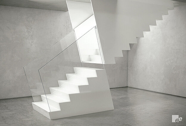 EeStairs heeft honderden trappen gemaakt en geïnstalleerd. Maar het bedrijf is ook erg geïnteresseerd in designideeën - innovaties die onze klanten aanmoedigen om gedurfd te denken. Hier is een ontwerp uit het EeLab van EeStairs - een trap met een spiegelend effect. De manier waarop de glazen balustrades overgaan in witte stalen balustrades is volgens EeStairs zeer uniek door het contrast tussen de twee materialen.
