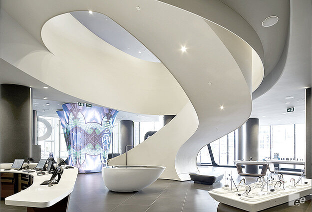 Wanneer u de Samsung Experience Store in het Eaton Center in Toronto binnenstapt, wordt de ruimte met twee verdiepingen gedomineerd door een buitengewone trap - als de laatste swirl van softijs in een hoorntje. De manier waarop de balustrade rondom het trapgat naar beneden buigt in de trapbalustrade is pure visuele magie - benadrukt door de witheid en de perfecte lijn van de rand van het trapplafond.