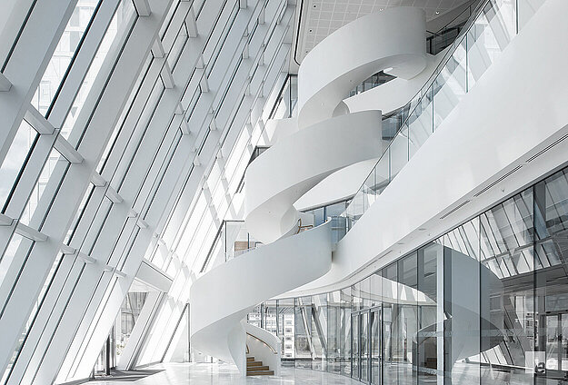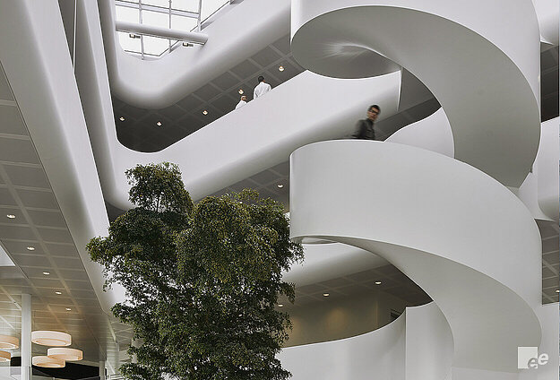 Volkomen logisch is het atrium in het hoofdkantoor van Vreugdenhil Dairy Foods in Nederland, ontworpen door Maas Architecten en SOM=, een melkwitte trap die volgens Maas op een 'luie' manier rond een boom draait.