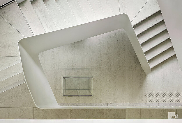 Het kantoorgebouw Pericles in Brussel heeft een trap van grote finesse - minimalistisch design op zijn best door Vorm Interieurgroep. Let op de grijswitte stenen vloer en treden, en de witte stalen balustrade: de zachte kleuren van de vloer en treden benadrukken de strakke lijnen en sterkte van de balustrade. Pericles was een beroemd Grieks politicus uit de oudheid, en een van zijn uitspraken luidde: "Wij cultiveren verfijning zonder extravagantie". Wat het ontwerp van deze trap perfect beschrijft...