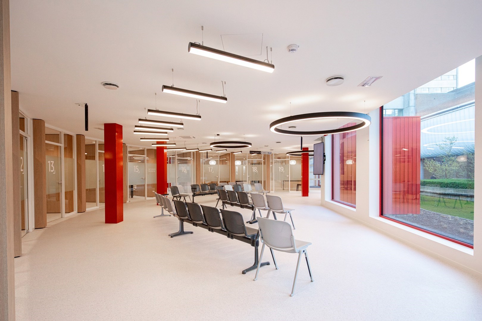 De aanmeldzuilen, de inschrijfbalies met loketten en de gespreksruimtes voor vertrouwelijke gesprekken werden strategisch geïntegreerd voor een klantvriendelijke dienstverlening. Het nieuwe inkompaviljoen huisvest daarnaast een aantal administratieve backofficediensten. Ook die functionele ruimtes zijn modulair opgebouwd, waardoor aanpassingen steeds mogelijk blijven.
