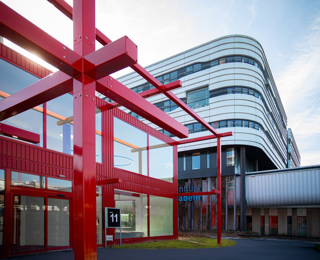 Het project bewijst eens te meer dat modulair bouwen én een hoogstaand architectonisch ontwerp perfect kunnen samengaan. Met zijn opvallend rode kleur fungeert het inkomgebouw als een aantrekkelijk baken op de ziekenhuissite. De voorgevel bestaat uit glas en een staalstructuur. De entreehal baadt daardoor in natuurlijk licht en biedt een vrije hoogte van 6,7 meter. De vormgeving en indeling nodigt bezoekers uit om binnen te komen en laat hen in een vloeiende beweging doorstromen naar de correcte wandelrichting. De aangewezen flow wordt extra gestimuleerd door kleuraccenten op de vloer, wand- en kolombekleding, de ronde vormen van de scheidingswanden en de vloeiende lijnen van de verlichting.