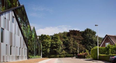 Op de voorgevel is een fotomontage van het aangrenzende bos aangebracht, zodat het gebouw versmelt met zijn omgeving.