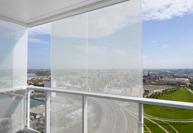 Elke studio of appartement beschikt over een eigen terras. Om een comfortabel gebruik hiervan mogelijk te maken, werd een bijzonder windweringsconcept ontworpen door de architecten, waarvan de effectiviteit door controleberekeningen aan de Technische Universiteit van Eindhoven werd getoetst. Het resultaat was zeer positief: de geplaatste glaspanelen, die de privacy beschermen en hoogtevrees elimineren, beperken de windhinder tot een absoluut minimum, zelfs op grote hoogte. Daarnaast spelen ze een bepalende rol in de look van het gebouw door functionaliteit en vormgeving te harmoniseren.