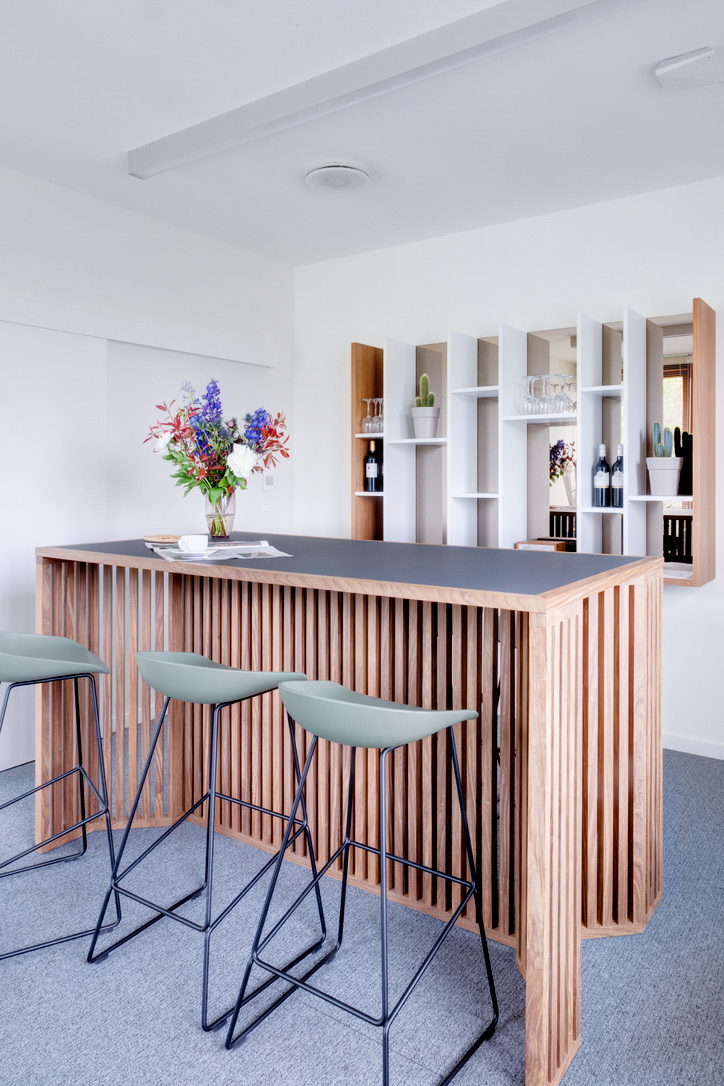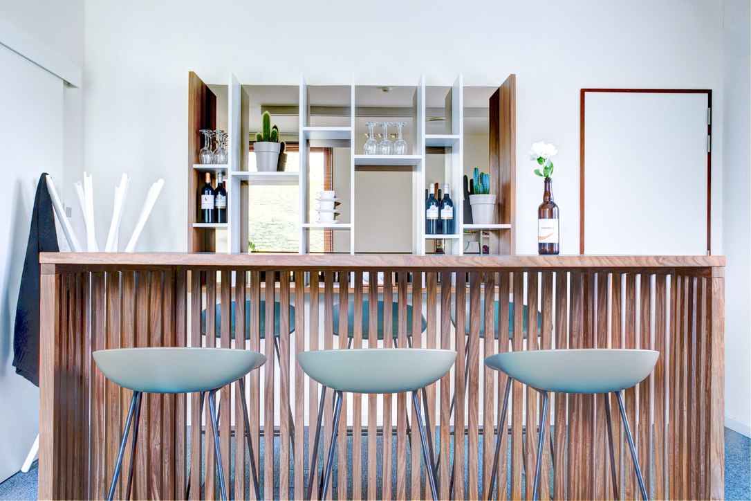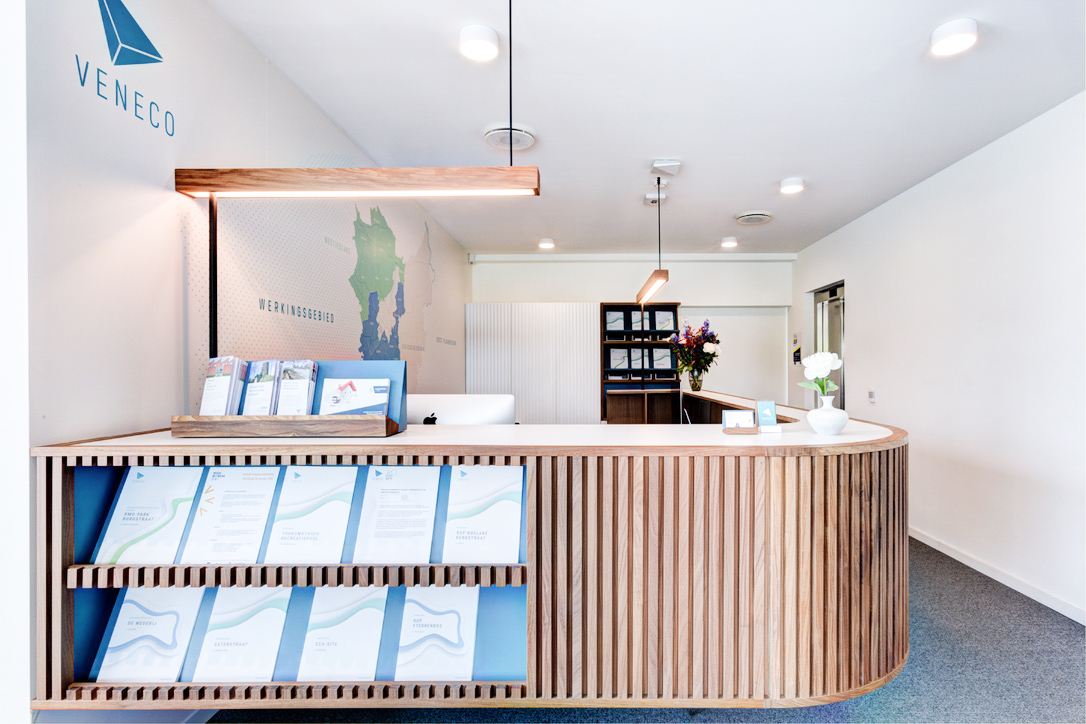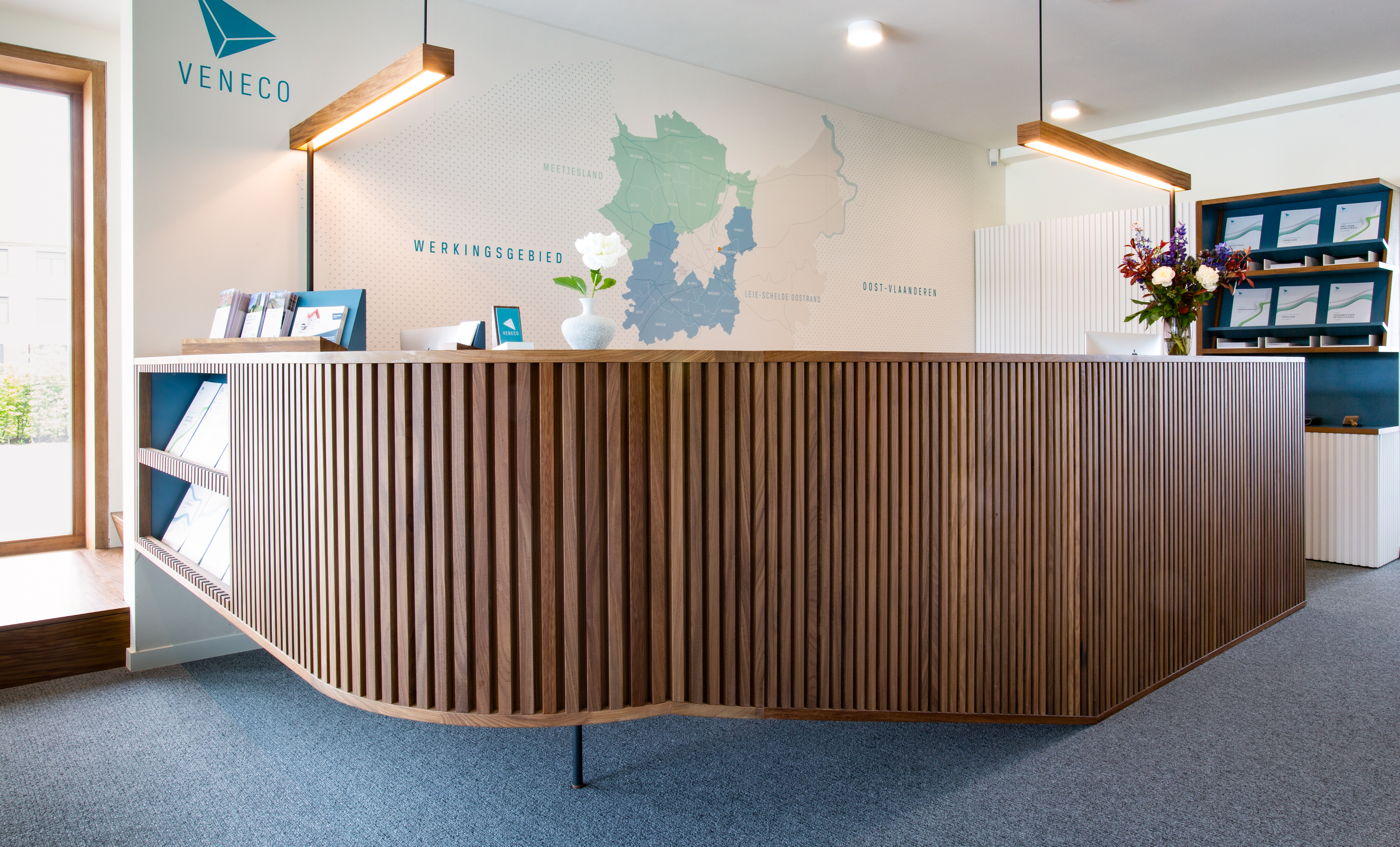 “Dan kies ik voor het gebouw van Havana Architectuur waar Veneco gevestigd is in Destelbergen. De constructie heeft aan de buitenzijde een sterke vormentaal met een warme uitstraling en een typisch zaagtanddak. Veneco vroeg me om maatwerk te ontwerpen voor een balie in de inkomhal, een koffiehoek in de grote vergaderzaal en een bar in de kleine vergaderruimte. Ook op ‘De Ganzenpaskruk’ ben ik fier. De multifunctionele kruk is opgebouwd uit 4 componenten en vervaardigd uit berken multiplex.”