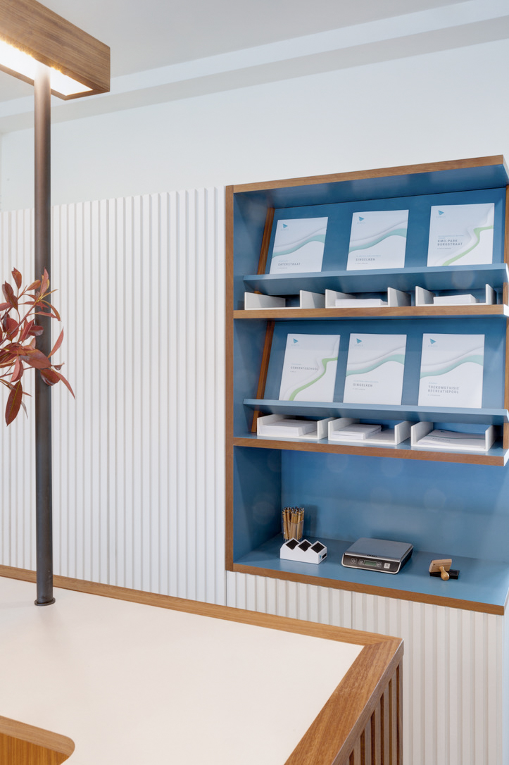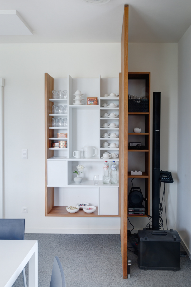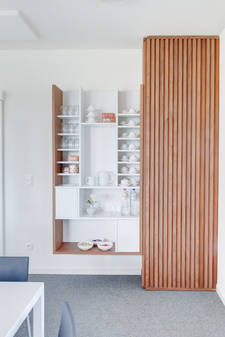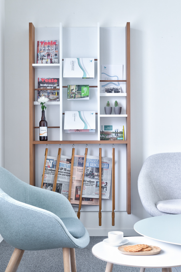 “Dan kies ik voor het gebouw van Havana Architectuur waar Veneco gevestigd is in Destelbergen. De constructie heeft aan de buitenzijde een sterke vormentaal met een warme uitstraling en een typisch zaagtanddak. Veneco vroeg me om maatwerk te ontwerpen voor een balie in de inkomhal, een koffiehoek in de grote vergaderzaal en een bar in de kleine vergaderruimte. Ook op ‘De Ganzenpaskruk’ ben ik fier. De multifunctionele kruk is opgebouwd uit 4 componenten en vervaardigd uit berken multiplex.”