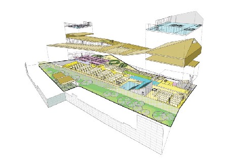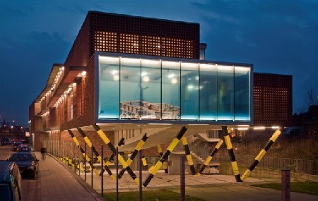 De bibliotheek in Dendermonde. Een bibliotheek samen met een polyvalente zaal, een sociaal restaurant en een daklandschap dat als parking én publieke ruimte kan fungeren. Het project zal in de loop van 2010 opgeleverd worden.
