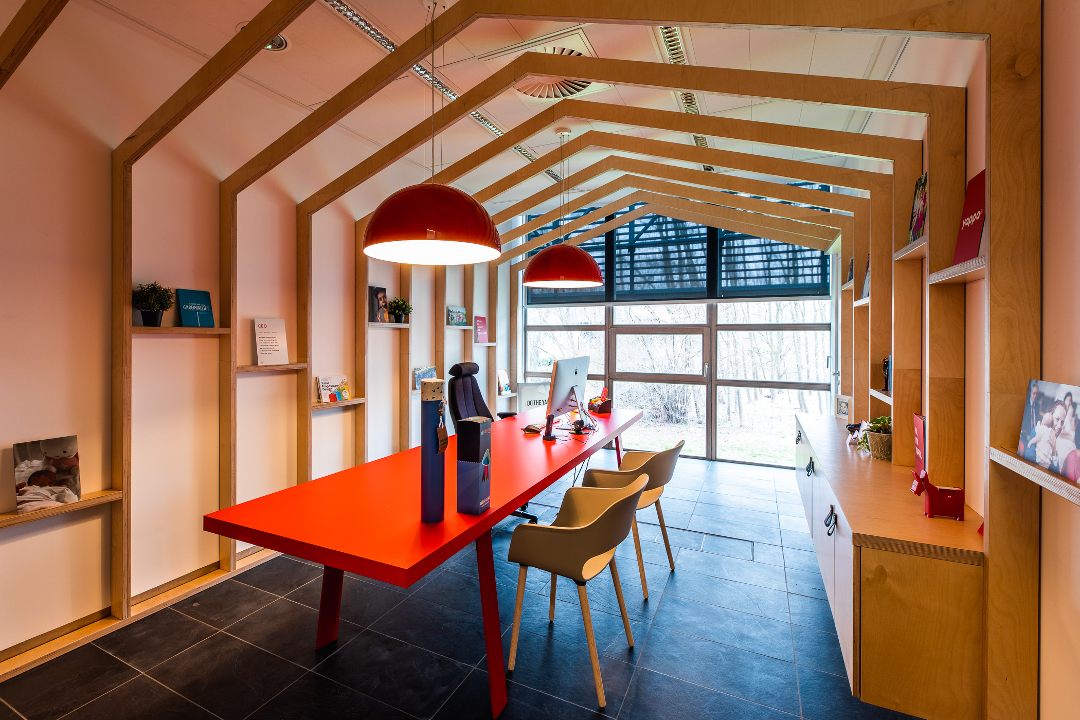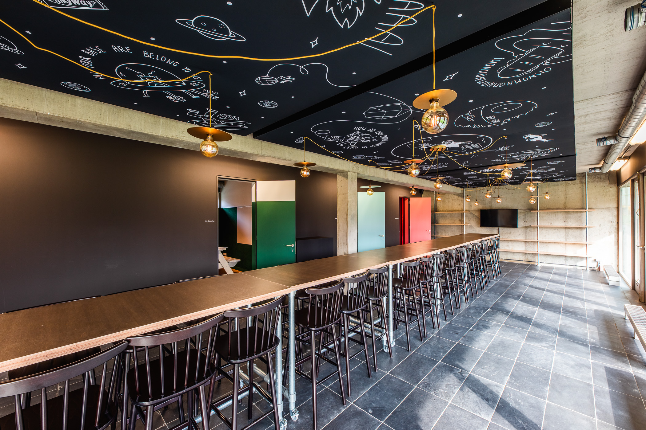 “Kiezen tussen projecten is geen makkelijke opgave. Om er toch een recente naar voren te schuiven, ga ik voor het kantoor van Yappa. Van het ontwerp tot de uitvoering mochten we hier volledig ons ding doen. De enige voorwaarde was dat we de slimste en leukste werkplek van Limburg maakten. Uiteindelijk namen we zo goed als het volledige gebouw onder onze handen, enkel de toiletten bleven gespaard van onze creatieve bende. Het resultaat zijn onder andere zeven ontmoetingsruimtes, met ieder hun eigen thema. Er zijn bijvoorbeeld een ballenbad en een boomhut aanwezig.”