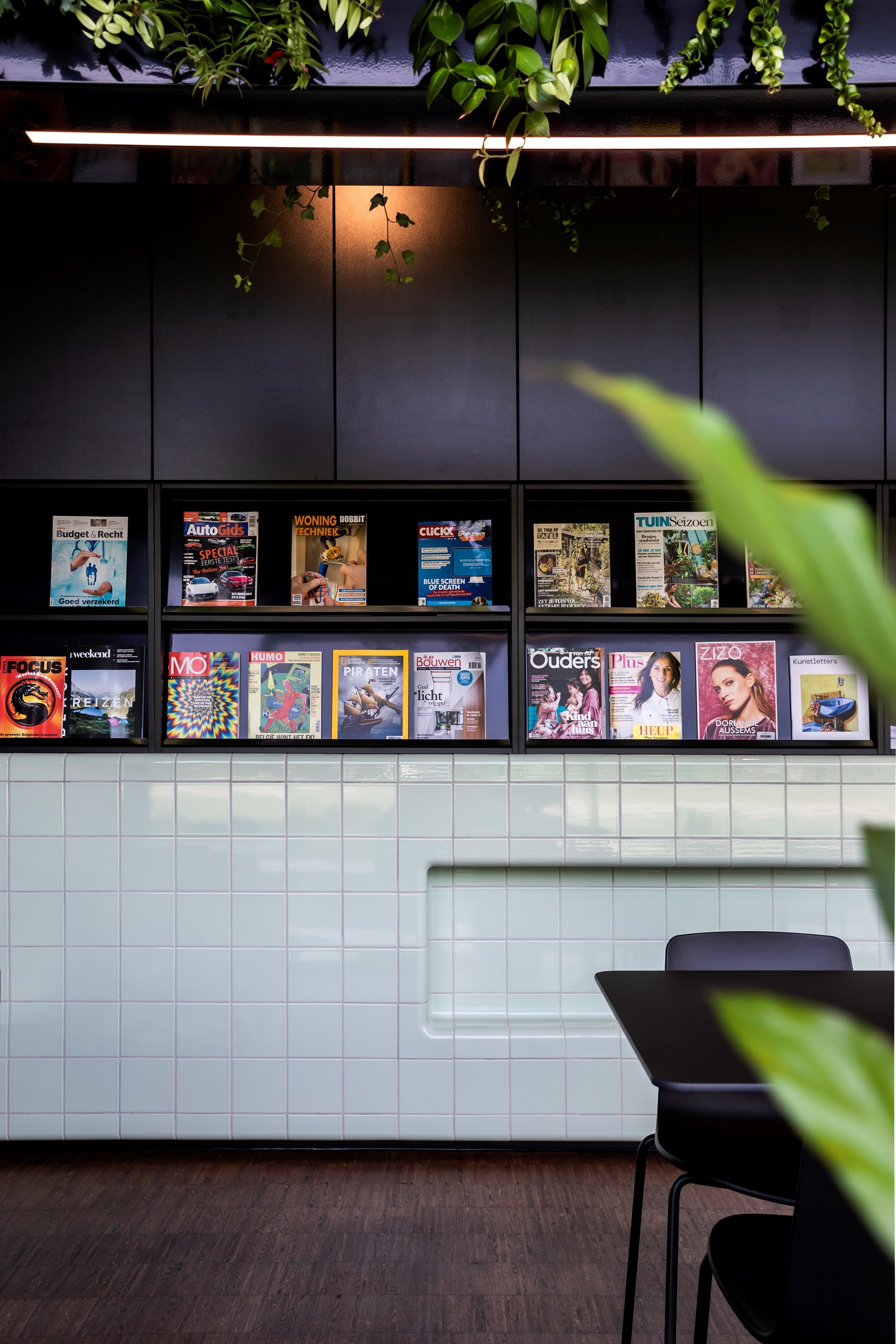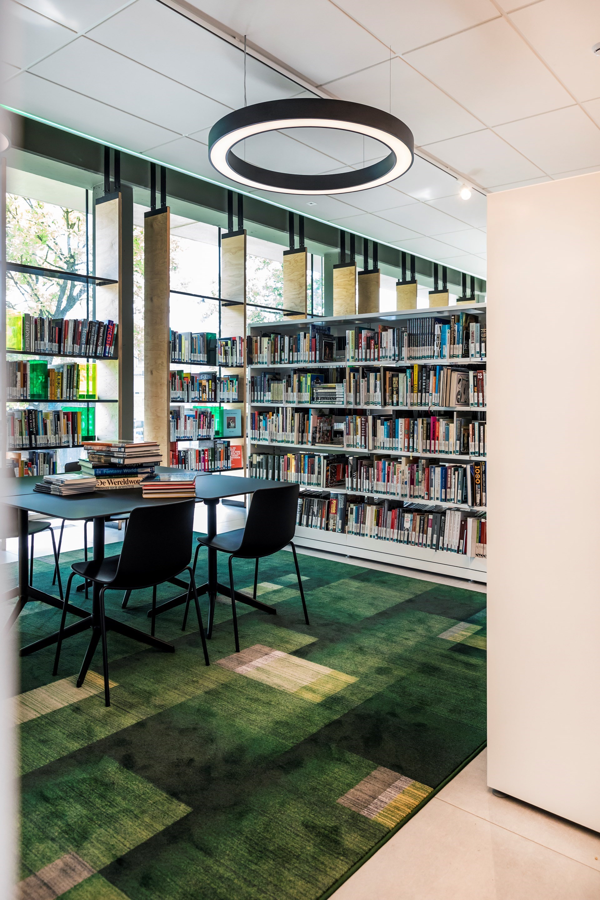 De bibliotheek van As is geen gigantische bibliotheek, toch vonden we het erg belangrijk dat deze bibliotheek meer dan een boekenrij zou worden. De boekenrekken zijn geschakeld, waardoor er verschillende plekken en sferen ontstaan. Sommige van deze plekken dienen als multifunctionele ruimte en kunnen doorheen de tijd wijzigen. De toog aan de inkom benadrukt de sfeer van “buurthuis” die we in dit project wilden steken. Een uitdaging was het vele glas in het gebouw. Niet eenvoudig om een kleine bibliotheek in te richten zonder veel wanden. We kozen voor de oplossing om de boekenrekken ook voor de ramen te zetten. Dit werd tevens de baken van bibliotheek in het straatbeeld.