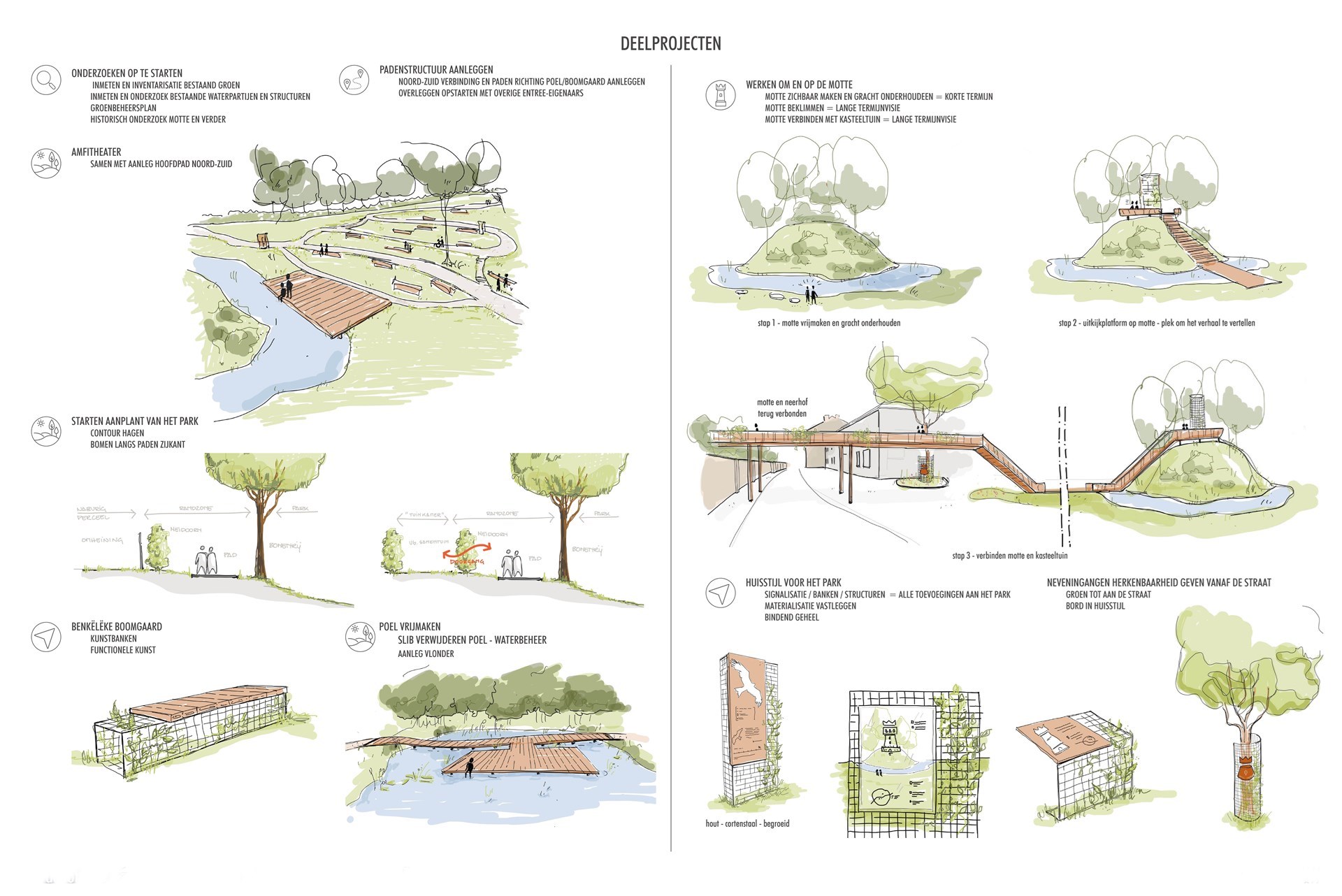 Een project dichtbij (mijn eigen) huis. Het centrale stuk groen verscholen achter gesloten gevels van het dorpscentrum van Hoeselt moet een groene long voor het dorp Hoeselt worden. Na een participatief traject met de bevolking en stakeholders stelden we een inrichtingsplan op. Hierin werden de krijtlijnen uitgezet van hoe we kunnen omgaan met dit waardevol stukje landschap en hoe we het kunnen opwaarderen tot park. Zoals de naam al verklapt, bevindt er zich een historische Mot met gracht op de site. Ook deze mot en de geschiedenis van Hoeselt worden in de kijker gezet. Groenblauwe dooradering wordt steeds belangrijker. Daarom is de bescherming van dit soort plekken in dorps- en stadkernen erg waardevol.