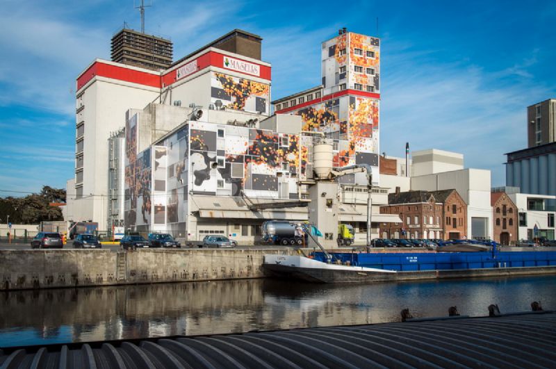 Een tweede project waar ik met enige trots aan terugdenk is NIARGTZAG. Deze muurprint werd gemaakt in het kader van de tentoonstelling Kanal - Ondernemen is een kunst (Roeselare, 2012). Hier pakte ik de gevels van de graanfabriek Maselis in met een reusachtige muurprint. NIARGTZAG fungeert als een surrealistische röntgenfoto: wat onder de oppervlakte ligt, wordt aan het licht gebracht, het is een abstracte weergave van het productieproces in de fabriek. De tweede laag van de muurprint is een doorsnede van de fabriek. Het startpunt voor dit werk was dus geen wit doek, maar een oude fabriek vol stoorzenders zoals ramen, uitlaten en roosters. Door die elementen en door het 2D-gegeven werd ik uitgedaagd om buiten mijn normale denkpatroon te creëren.