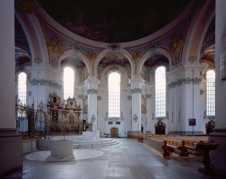 Ik keer graag terug tot het werk van Caruso St John Architects met twee interventies, bescheiden in schaal. Een eerste, die me erg interesseert op vlak van materialiteit, is de interventie aan het koor binnen het barokke interieur van de kathedraal van Sankt Gallen. Hier zat de moeilijkheid om een moderne interventie te verwezenlijken in een dergelijke context.