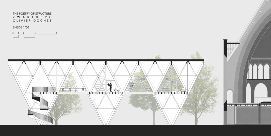 Een ander project waar ik fier op ben is een ontwerp voor de studio ‘Poetry of Structure’ binnen de eerste master architectuur. Hier werd gevraagd om, binnen vooraf opgelegde afmetingen en de regio rond Zwartberg, een structuur te ontwerpen die twee programma’s tegelijk kan huisvesten. Ik vestigde me linksachter de mijnkathedraal van Zwartberg waar ik, in samenhang met het gegeven van de kerk en de naastgelegen school, terug een gemeenschapsgevoel wou creëren met een structuur die zowel een markthal als, daarboven, een kleinschalige bibliotheek huisvest. Dit door middel van een houten ribstructuur die op een moderne manier terugverwijst naar de context van de kerk (ontwerp van Henry Lacoste). Het bleek een modulaire structuur die veel potentieel bevat op vlak van ruimtelijkheid.