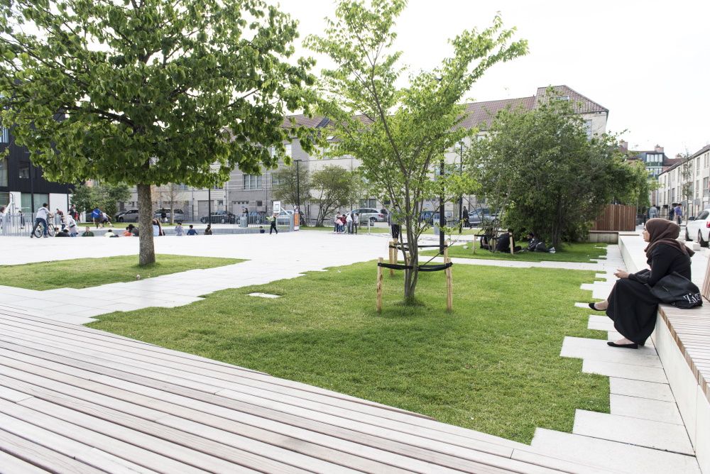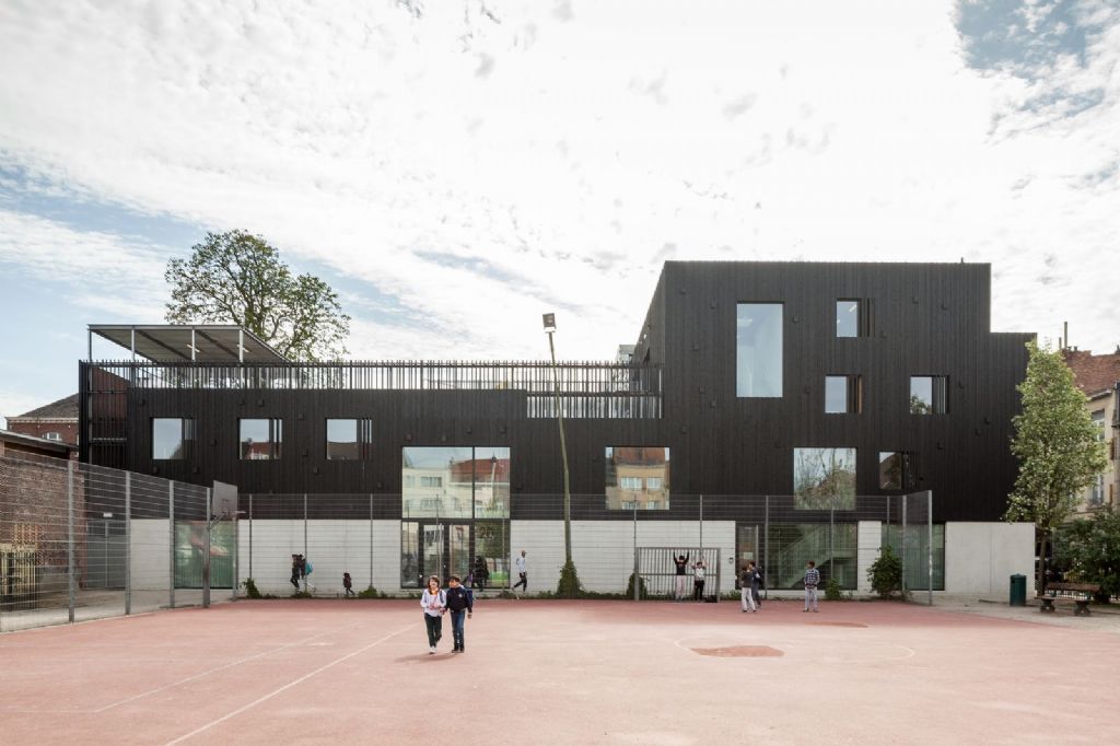 Ten eerste op Bonnevie, een van de projecten met de grootste oppervlakte in het diagram, en dus een bijzonder hoge maatschappelijke relevantie. Bonnevie is een buurthuis met park in het centrum van Sint-Jans-Molenbeek. We wonen zelf in de buurt en zien dat zowel het gebouw als het park op verschillende manieren en tijdstippen zeer intensief gebruikt worden door mensen met verschillende culturele achtergronden en vanuit alle leeftijdsgroepen.
