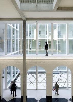 Van het stadhuis Harelbeke. Zowel qua ligging als qua functie is het stadhuis één van de belangrijkste gebouwen in de stad. Het zal voldoen aan alle hedendaagse eisen inzake comfort en duurzaamheid. Vormelijk is het gebouw een geslaagd voorbeeld van een hedendaagse integratie in een historische context.