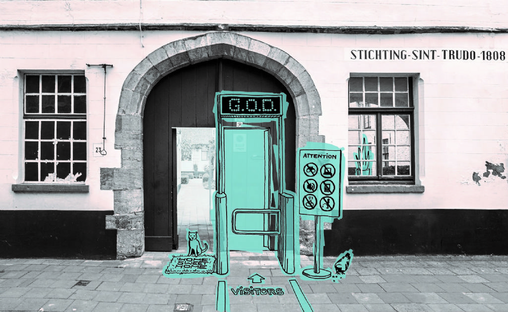 Godshuisjes zijn sinds de 14de eeuw een vorm van sociale huisvesting. De kleine wooneenheden - vandaag betrokken door alleenstaande ouderlingen - staan meestal gegroepeerd rond semi-publieke binnentuinen. Enerzijds is de binnentuin de enige buitenruimte en gemeenschappelijke tuin voor de bewoners, anderzijds is de plek ook een toeristische trekpleister waar bezoekers het erfgoed komen ‘consumeren’.