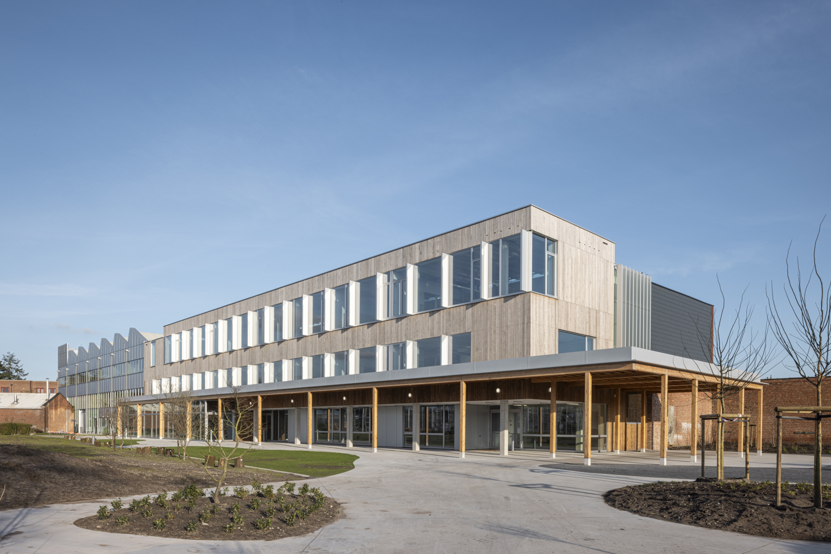 Provinciale Technische School PTS Mechelen: de nieuwbouw van een schoolgebouw waar we door een intensieve samenwerking met de bouwheer (Provincie Antwerpen) en de diverse partners in ons team (Bas, Cenergie, Ars Horti) een flexibel, circulair en biobased schoolgebouw realiseerden.
