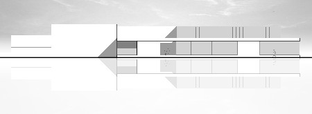De 45m lange autoshowroom DWM, gesitueerd in een woongebied en ontworpen als een paviljoen/villa.