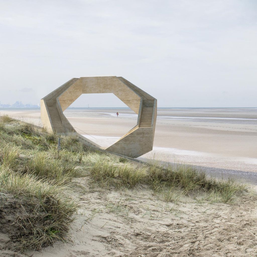 Westerpunt in de Panne, een uitkijktoren in het verste hoek van België, dicht bij de Franse grens. Het is een betonnen trap die op een organische manier uit de dijk groeit om terug naar de zee af te dalen. Het ironische is dat de toren niet hoger dan 7m mocht zijn. Mo en ik hebben dus gekozen om de trap als deel van de wandeldijk te beschouwen en als lus boven het strand te laten uitkragen. Ook dit project was er een van lange adem, maar dit jaar zal het er eindelijk staan.