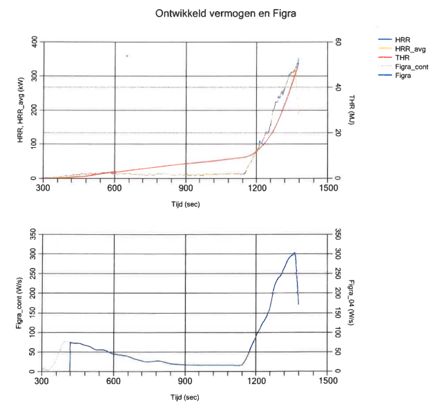 Tot in minuut 19 verkreeg de houthandel een stabiele brandreactieklasse B met sterke brandwaardes als een FIGRA van +- 70W/s (grenswaarde brandreactieklasse B - 120W/s) en een THR600 van 6,33 MJ (grenswaarde brandreactieklasse B 7,5 MJ). Plots ontaarde deze schijnbaar perfecte brandtest in een brandinferno. Deze specifieke opbouw zorgde ervoor dat de verschillende materialen een enorme impact op elkaar hadden en tijdens een enorme, exponentiële groei werd de brandtest abrupt op +-350kW stopgezet.