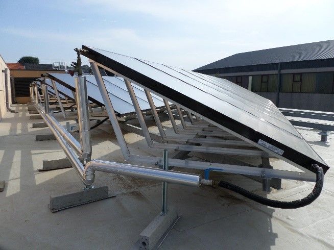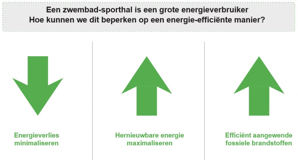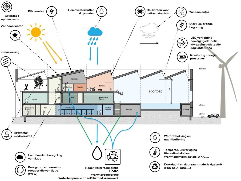 - Een WKK en zonnecollectoren dekken de warmtevraag voor de ruimte, het zwembadwater en de productie van sanitair warm water. Met een condenserende ketel worden de pieken opgevangen. De WKK dient eveneens om het basis elektrisch verbruik te dekken (pompen, ventilatoren, etc.).