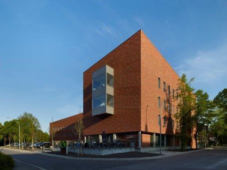 De specifieke locatie vormde een belangrijke factor in het ontwerpproces. Aangezien het complex deel zou gaan uitmaken van een historisch waardevolle locatie, moest de architect rekening houden met strenge stedenbouwkundige voorschriften. “Enerzijds moesten we als verwijzing naar de kerk een soort toren integreren in het ontwerp, anderzijds dienden we aansluiting te vinden bij de bouwlijnen van de oude schoolgebouwen aan de andere zijden van het plein,” vertelt projectarchitect Jochen Kerkhofs. “We hebben deze eisen op moderne wijze vertaald en hebben geopteerd voor een gespiegeld L-volume waarbij de kop van het korte gedeelte uittorent boven het langwerpige gedeelte van het gebouw. Het hoogste punt van de kop komt overeen met het hoogste punt van de kerktoren en de toren van het tegenoverliggende Syntra-gebouw. De schuin oplopende daklijnen vestigen de aandacht op dit uitspringende hoekvolume. Voorts is de betonnen basisstructuur afgewerkt met verlijmde bakstenen, wat het complex zowel een strakke, moderne als een authentieke, ambachtelijke look geeft. Tot slot zijn er de vele hoge raampartijen in de gevel, die De Vierde Wand eenzelfde verticaliteit geven als de aanpalende historische gebouwen.”