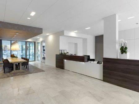 De Vierde Wand is zeker geen 'rusthuis' in de klassieke zin van het woord. Het hotelgevoel is meteen aanwezig. Op rechts vinden we de strakke balie, links achteraan een gezellig zitgedeelte waar de bewoners graag gebruik van maken.