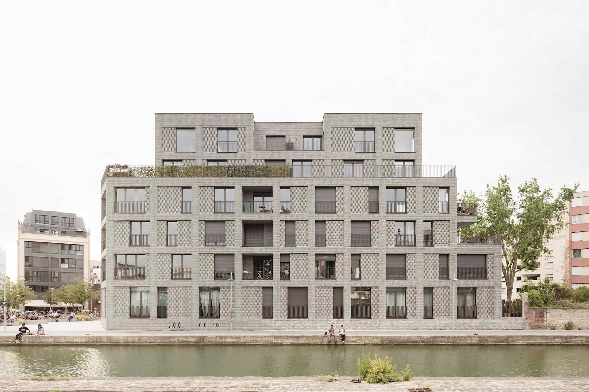 Deze drie gebouwen vormen samen een synthese van eenheid en verscheidenheid met in de baksteenkleur een modern antwoord op het bleke geel van de meelfabrieken van de Grands Moulins de Pantin die iets verder langs het kanaal liggen.