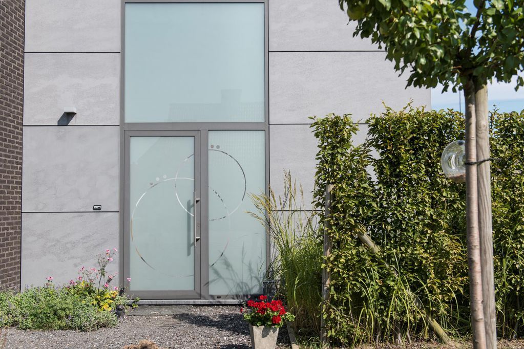 Decover personaliseert de inkomdeur - van een eenvoudig huisnummer over de naam van uw residentie - tot een persoonlijk design. Dit gebeurt via een gezandstraalde tekening in dubbele beglazing tot een design met dieptewerking in tripleglas.