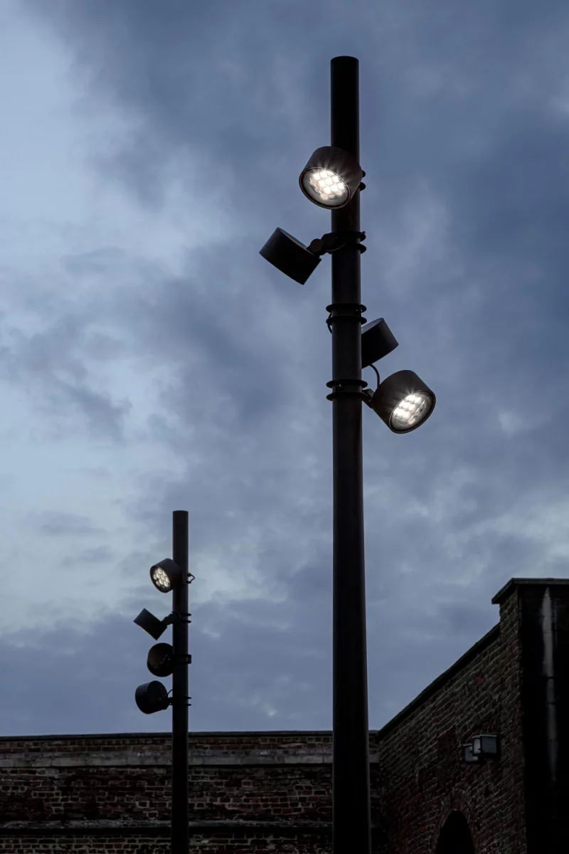 De Frax on Pole staan als bewakers over het uitgestrekte plein dat naar het kantoorgebouw leidt. Hoe imposant ze ook zijn, hun hoogstaand ontwerp biedt betrouwbare verlichting om bezoekers de weg te wijzen.