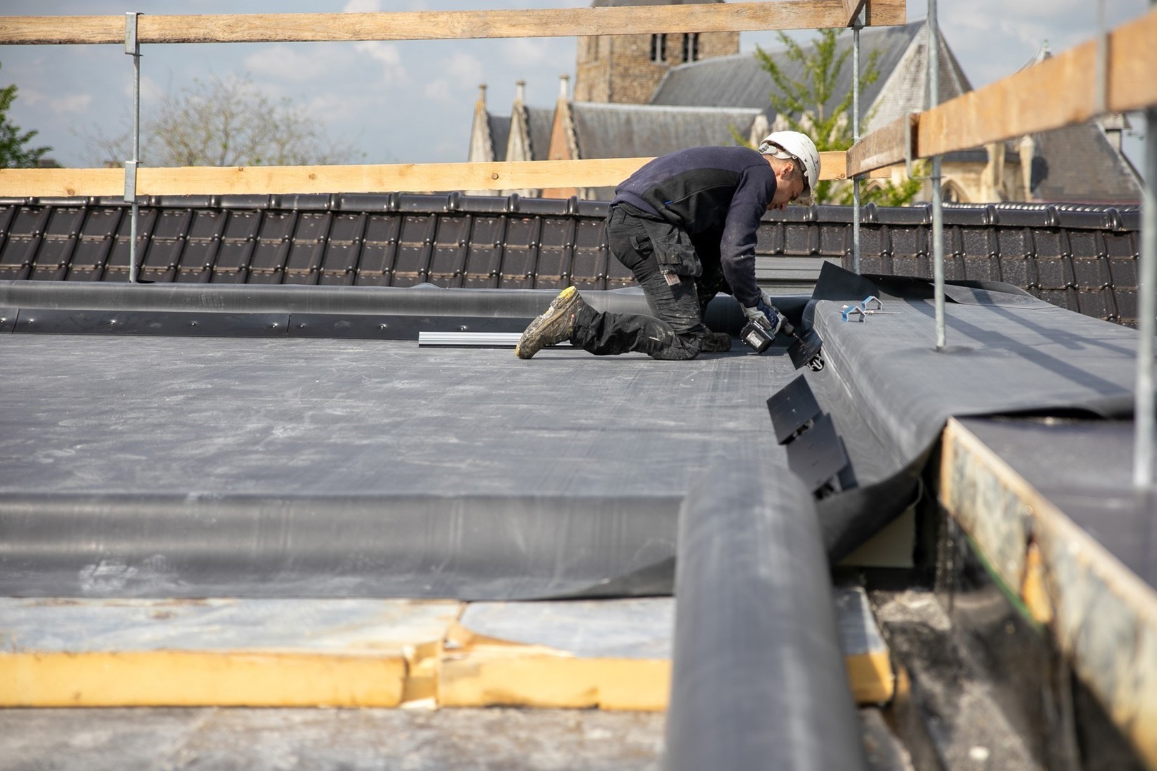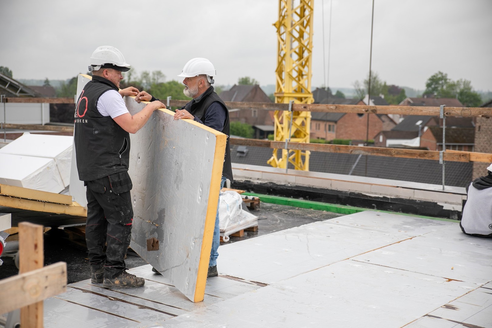 In ons land werden intussen, onder meer in Sint-Truiden en Kampenhout, al meer daken aangelegd met het demonteerbare platdaksysteem BossCover Circular System van CPE, een groothandel opgericht door Tectum Group in 1988 die gespecialiseerd is in producten voor daken en gevels. Maar in het project in Wellen werd het dus gecombineerd met gerecupereerde PUR-platen die eigenlijk bestemd waren voor de verbrandingsoven, een primeur voor een schoolgebouw. De isolatie is afkomstig van een afgebroken dak van een gebouw van OVAM in Mechelen. Ze deed daar 22 jaar dienst.