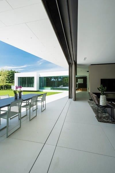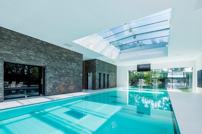 De vervaging van de grens tussen de binnen- en buitenruimtes vormt een constante doorheen het ontwerp van de woning. Verschillende Ceyssens-producten dragen daartoe bij. “Zo kunnen we het binnenzwembad gedeeltelijk omtoveren tot een buitenzwembad dankzij het Sliding Rooflight. De glazen koepel van 6 op 9 meter kan volledig openschuiven met een druk op de knop,” aldus Ceyssens. De koepel bestaat uit driedubbele beglazing met de nodige zonwerende eigenschappen, waarbij de buitenruit verwarmd wordt eens de buitentemperatuur onder de drie graden daalt. Ook de binnenzijde is verwarmd om condens tegen te gaan.
