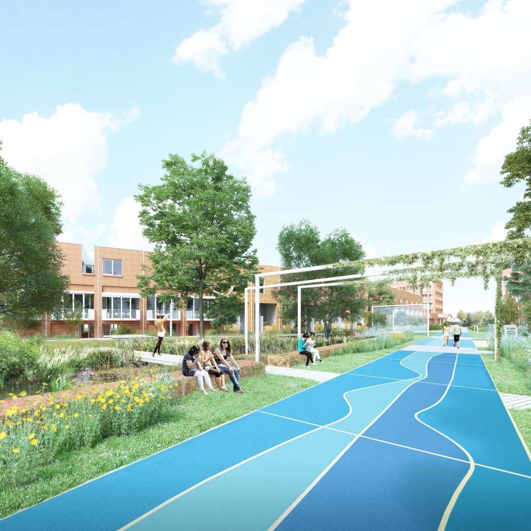 De ambitie om van deze voormalige sportsite een modelwijk voor de 21ste eeuw te maken, vertaalt zich ook in het materiaalgebruik en de technische aanpak. De ontwerpers passen Cradle to Cradle-principes toe waar mogelijk, maken bewuste keuzes in bouwmethodes en streven naar een “BREEAM Outstanding”-certificering. Dat betekent: minimale CO₂-uitstoot, hergebruik van water, hernieuwbare energie en duurzame materialen.