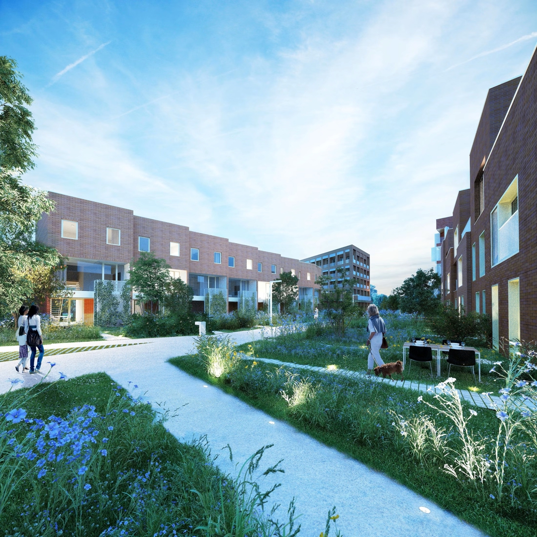 De schaal van de gebouwen blijft bewust beperkt. Geen hoogbouw hier, maar een gedifferentieerde, fijnmazige structuur die inspeelt op het menselijke perspectief. De oriëntatie van de woningen maximaliseert zonlicht en uitzicht op het groen. Binnenruimtes worden logisch georganiseerd rond leefkwaliteit, privacy en verbinding met buitenruimte. Ook de geluidshinder wordt beperkt dankzij de autovrije inrichting en doordachte plaatsing van functies.