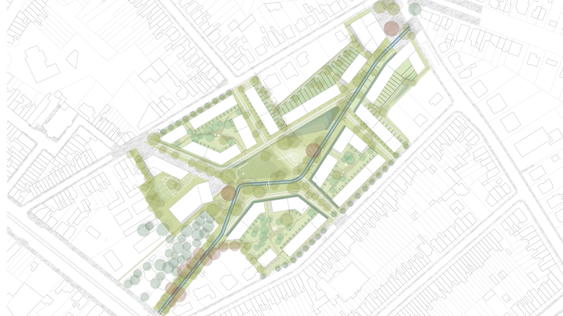 Het wijkontwerp van De Stip grijpt terug naar het sportieve verleden van de site. Het centrale wijkpark volgt de contouren van de vroegere sportvelden en refereert subtiel aan hun geschiedenis. Brede parkarmen verbinden de wijk met omliggende straten, fietsassen en openbaar vervoer. Twee pleintjes worden opgeladen met buurtgerichte functies, terwijl de wijk zelf volledig autovrij is. Parkeren gebeurt ondergronds, met ondersteuning van deelmobiliteit.