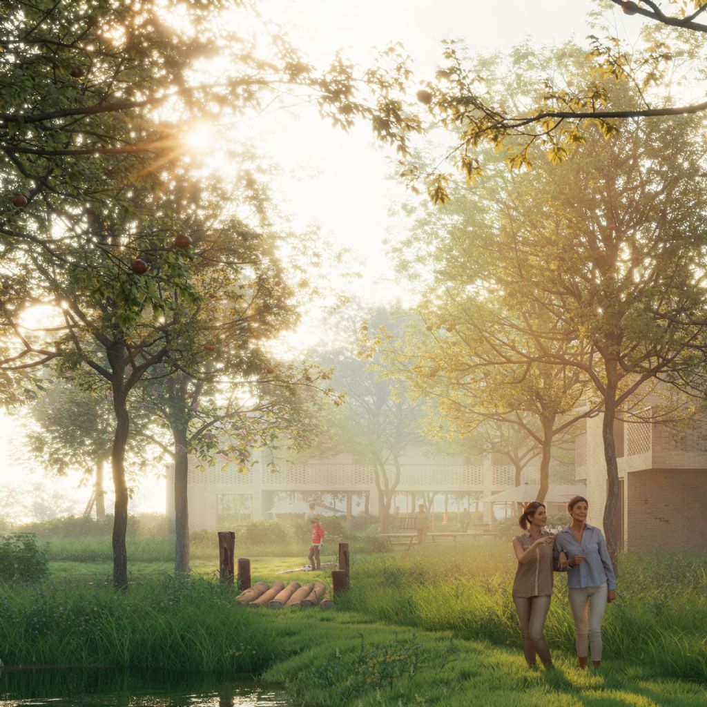Op de site treffen we een aantal oude fruitbomen aan in een extensief grasland, met op de achtergrond een prachtig agrarisch vergezicht, doorkruist door grachtstructuren. Met het oog op deze landschappelijke kwaliteit besloten de ontwikkelaar en het ontwerpteam in samenspraak om geen gestileerde tuin te maken, maar het bestaande vocabulaire als bouwstenen in te zetten bij de inrichting van het binnengebied. “We maken geen tuin maar werken het landschap af, vanzelfsprekend, alsof we er niet zijn geweest”, aldus Bart Cobbaert.