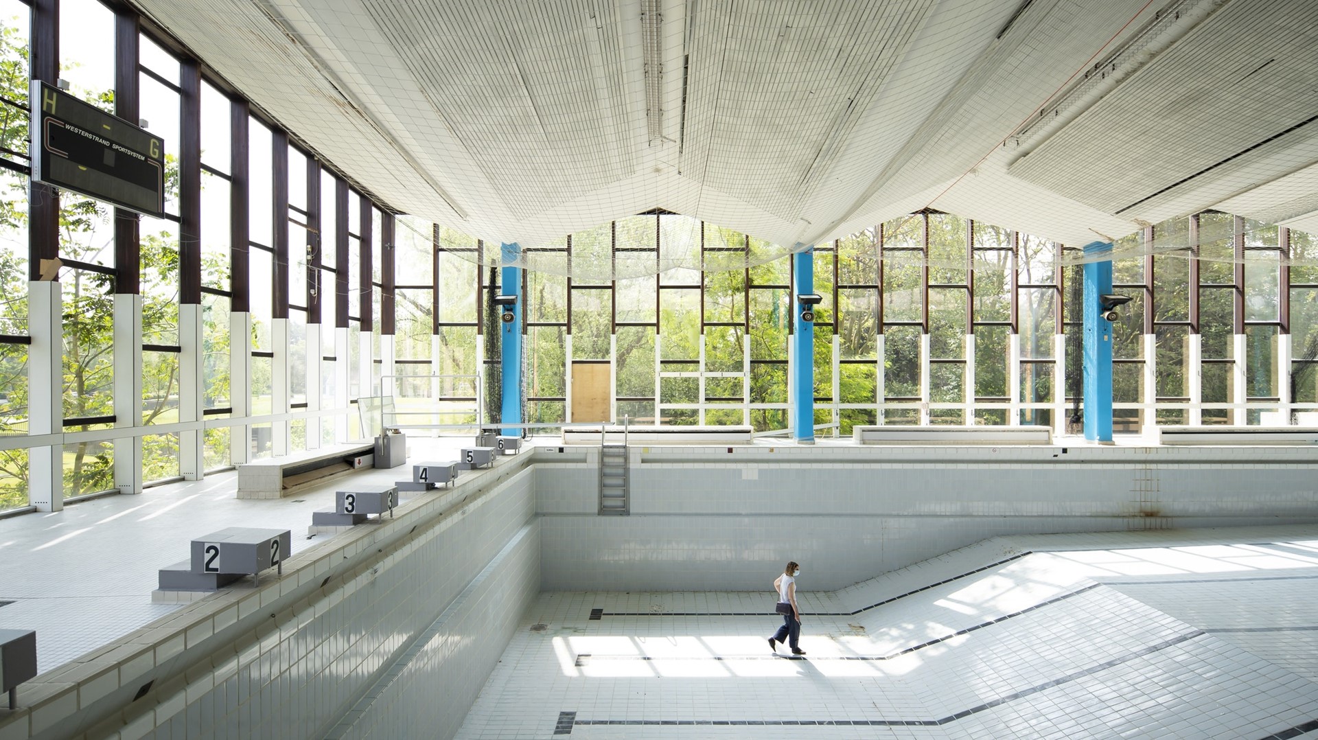 Het ontwerpteam gaf echter op veel meer manieren gehoord aan de voorwaarde om ruimtes en materialen maximaal te hergebruiken. Zo werden de houten kleedhokjes vakkundig gedemonteerd en genummerd. De architecten geven ze in hun ontwerp een nieuw leven als onder meer boekenkasten – deuren worden in open stand vastgezet – of zogenaamde concentratiecockpit – deuren kunnen toe. De zandfilters krijgen een mooie plek in de coffee corner.