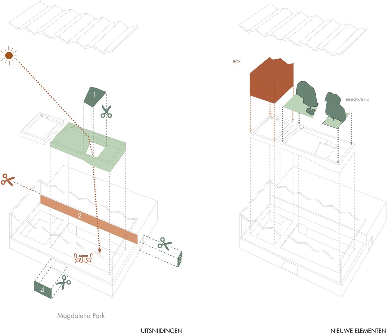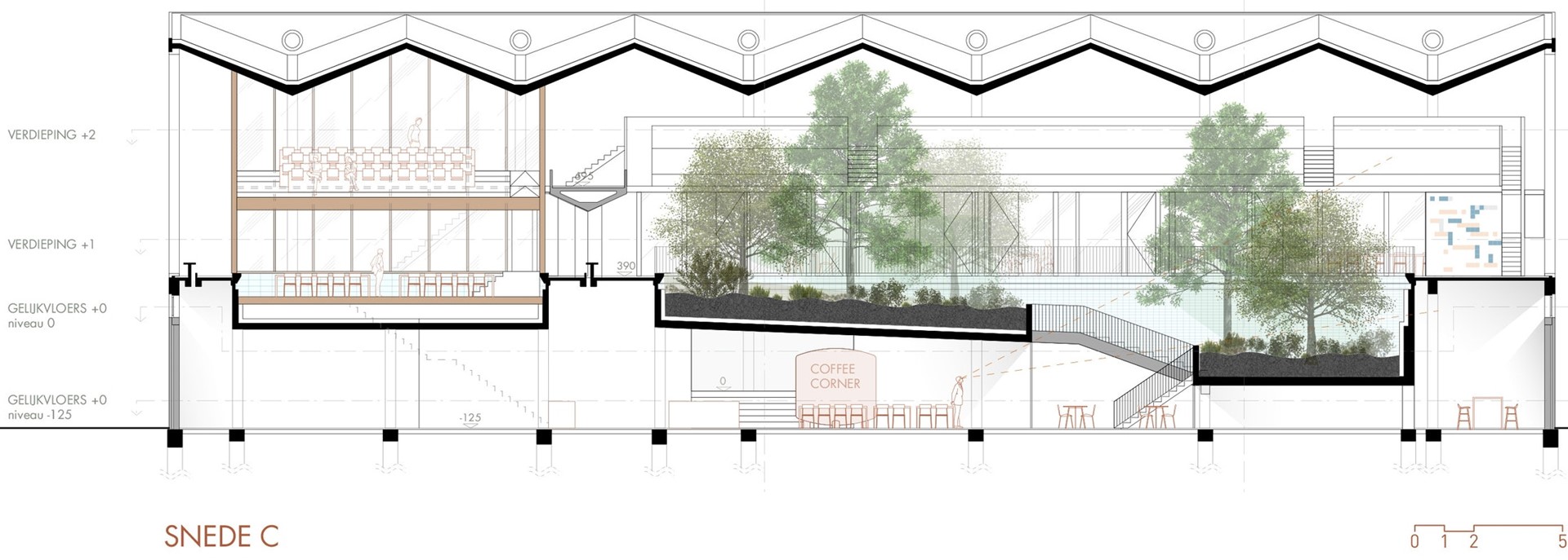 Het resultaat van bovenstaande denkoefening werd een knap staaltje ruimtelijk denken. In plaats van massa's geld te pompen in het onverenigbare verenigbaar te maken, koos het ontwerpteam ervoor de zwemhal te onttrekken aan het thermisch beschermd volume en de ruimte zo veel als mogelijk te erkennen in haar bestaande toestand. Door de voormalige grote zwembadkuip om te toveren tot overmaatse plantenbakken trekken de architecten de groene omgeving letterlijk naar binnen. De zwemhal van weleer wordt zo tegelijk het kloppende hart en de groene long van de campus. Climate responsive design, gezondheid en energieneutraliteit werden bij die ontwerpkeuze centraal gesteld: het gaat volgens de architecten niet gewoon om zogenaamd kijkgroen, de hal wordt ingezet als buffer voor verwarming, passieve koeling én klimatisatie.
