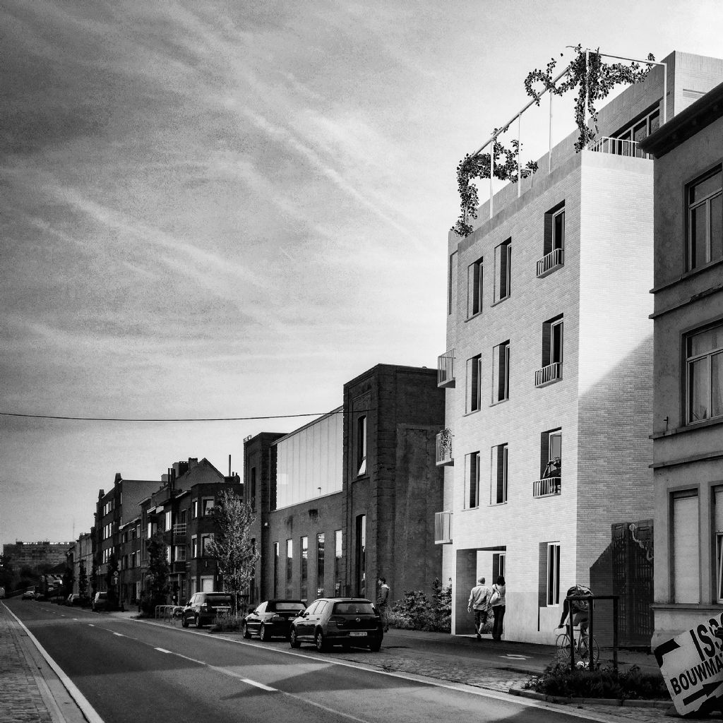 DENC!-STUDIO heeft de ontwerpwedstrijd gewonnen voor een woonproject met tien appartementen in de Gasmeterlaan in Gent. “Door de plaatselijke terugsprong van de voorgevel, wordt de grootschaligheid van het gebouw gebroken en sluit het gebouw op een kwalitatieve wijze aan op het aanpalende gebouw aan de linkerzijde. De architectuur is sober en de kleurstelling is passend. De volumewerking van de terugsprong, de uitkragende terrassen, het terugliggend metselwerk, de metaalstructuur en de materialisatie bieden eigenheid aan het gebouw”, aldus het juryrapport van de Stad Gent.