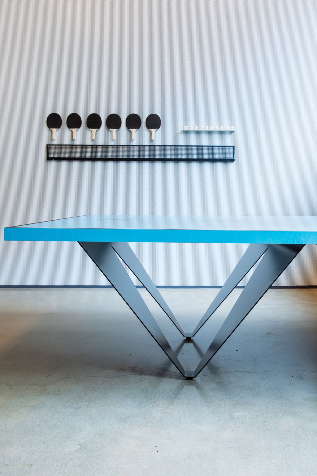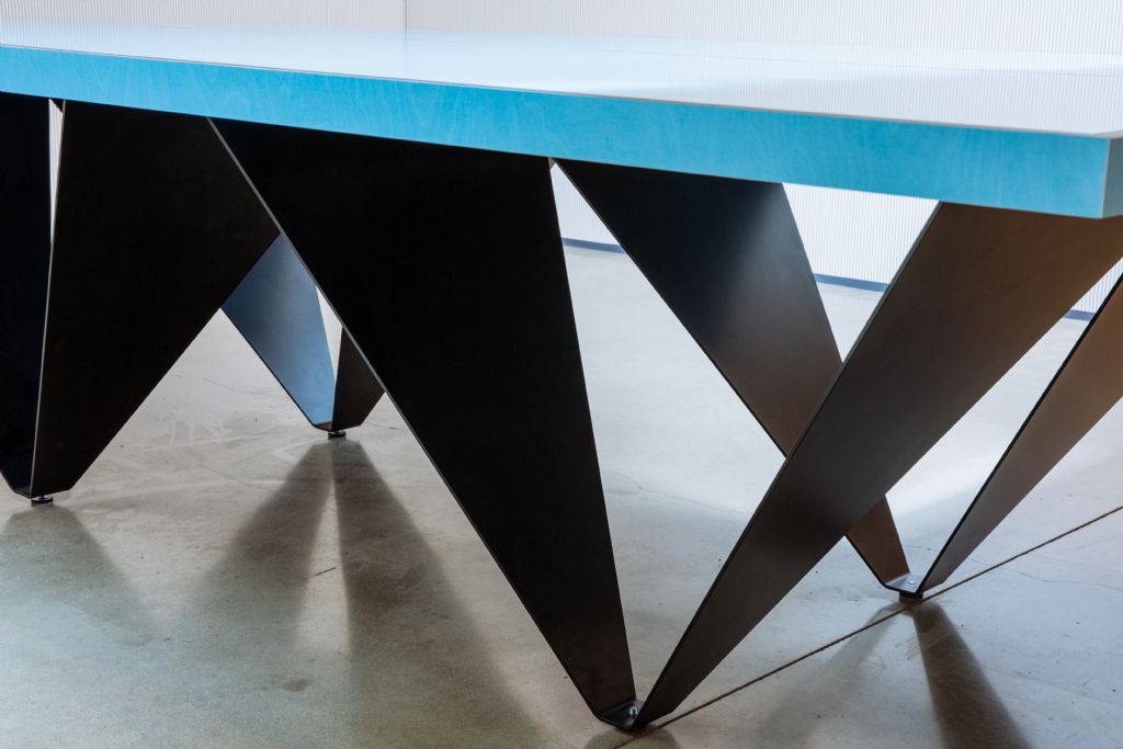Het ontwerp voor De Winkelhaak is uitgevoerd in twee types: een zwarte, strakke tafel voor in de ‘board room’ en een speelse blauwe pingpongtafel voor in de ‘action room’. Het onderstel vormt in zijaanzicht de letter ‘W’ van De Winkelhaak, alsook de botsende beweging over het net van de pingpongbal.