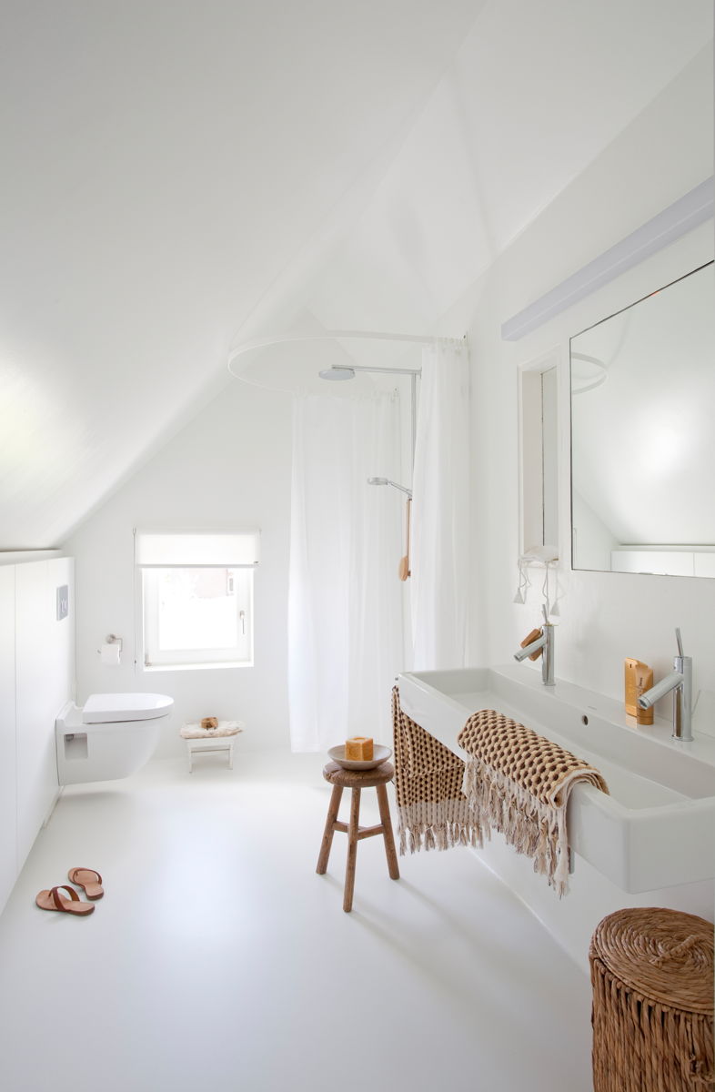 De hoofdbadkamer van het pand werd voorzien van een grote dubbele Vero wastafel en een toilet uit de Starck 3- serie. De ruimte werd optisch vergroot door te kiezen voor de kleur wit. Houten accessoires en rieten manden creëren highlights en onderstrepen de warme sfeer van de ruimte. In de kleinere gastenbadkamer werd dan weer gekozen voor een compacte variant van de Vero wastafel en wederom een wc uit de Starck 3- serie.
