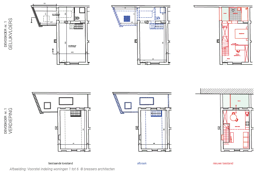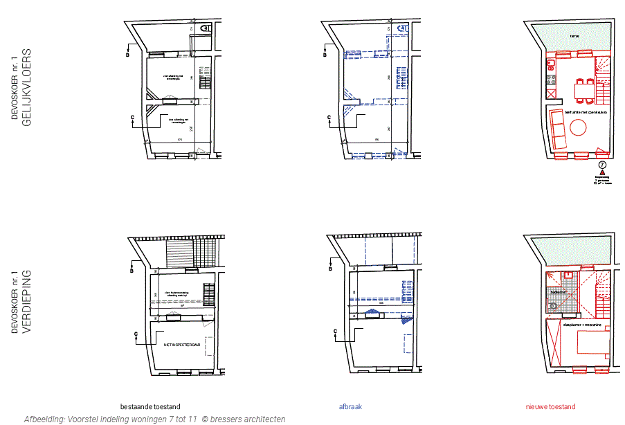 Om meer ruimte te voorzien in de kleine huizen van de Devoskoer, speelt Bressers met het idee om een nieuw volume op het zadeldak te creëren. Op die manier wordt de zolder een bruikbare ruimte. De zolder kan opengemaakt worden om een gevoel van ruimte te creëren, maar kan ook als afgesloten kamer gebouwd worden. Vanop het binnenplein zou het nieuwe volume amper zichtbaar zijn omdat ze aan de achterkant van de woning geïmplementeerd zou worden.