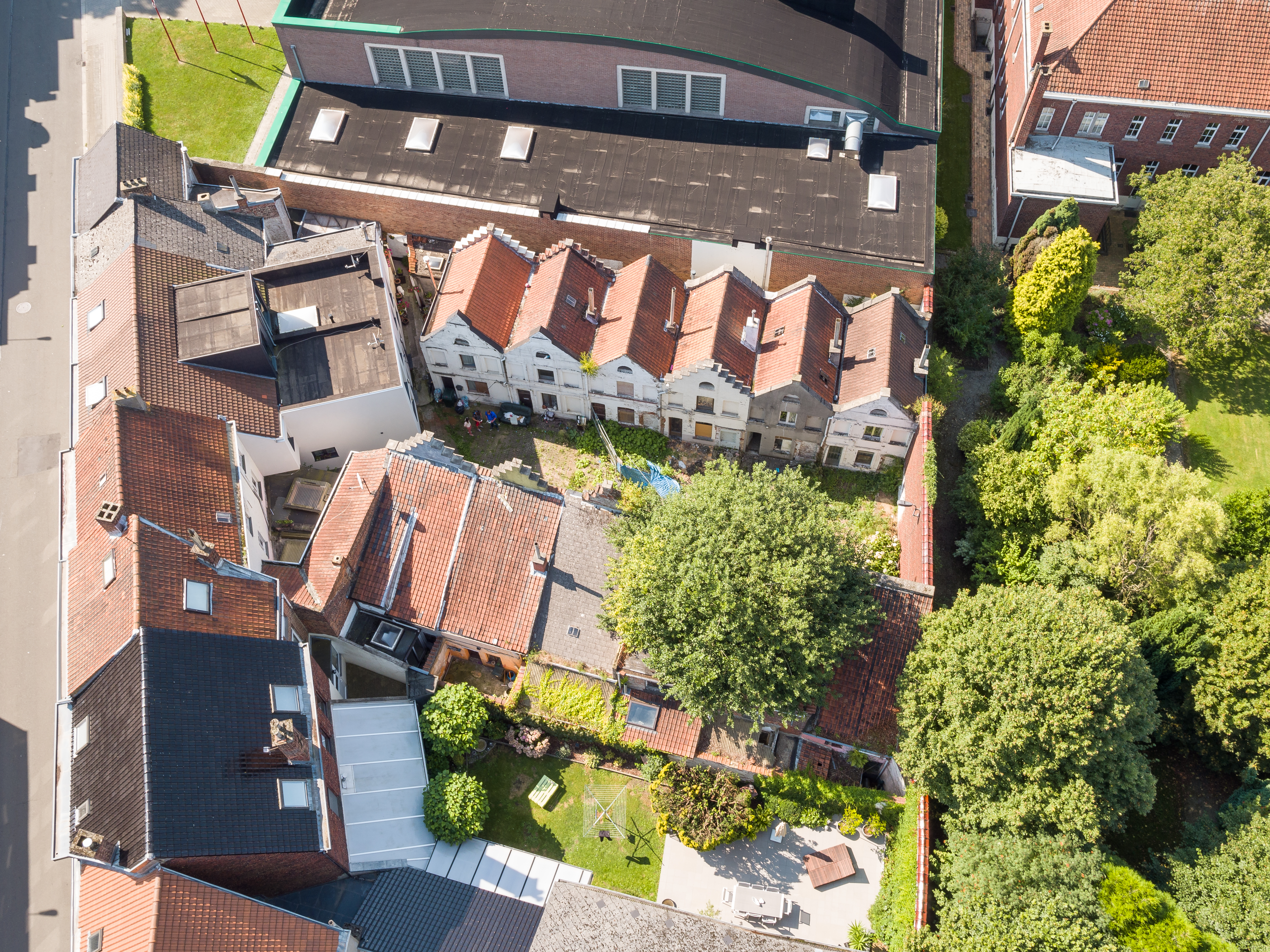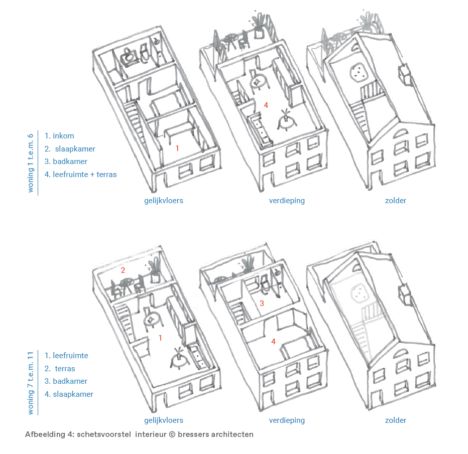 Dankzij hun ligging langs een 5,5 meter hoge muur krijgen de woningen aan de linkerkant van de binnenplaats een eerder atypische indeling. De leefruimte en de keuken zullen op de eerste verdieping geïnstalleerd worden, terwijl het gelijkvloers plaats zal bieden aan een bureau of bergruimte en een slaapkamer met badkamer. Door het koertje achteraan dicht te bouwen, kan de benedenverdieping uitgebreid worden met een kleine patio. Een terras op de eerste verdieping zal de leefruimte optisch vergroten en meer licht naar binnen halen.